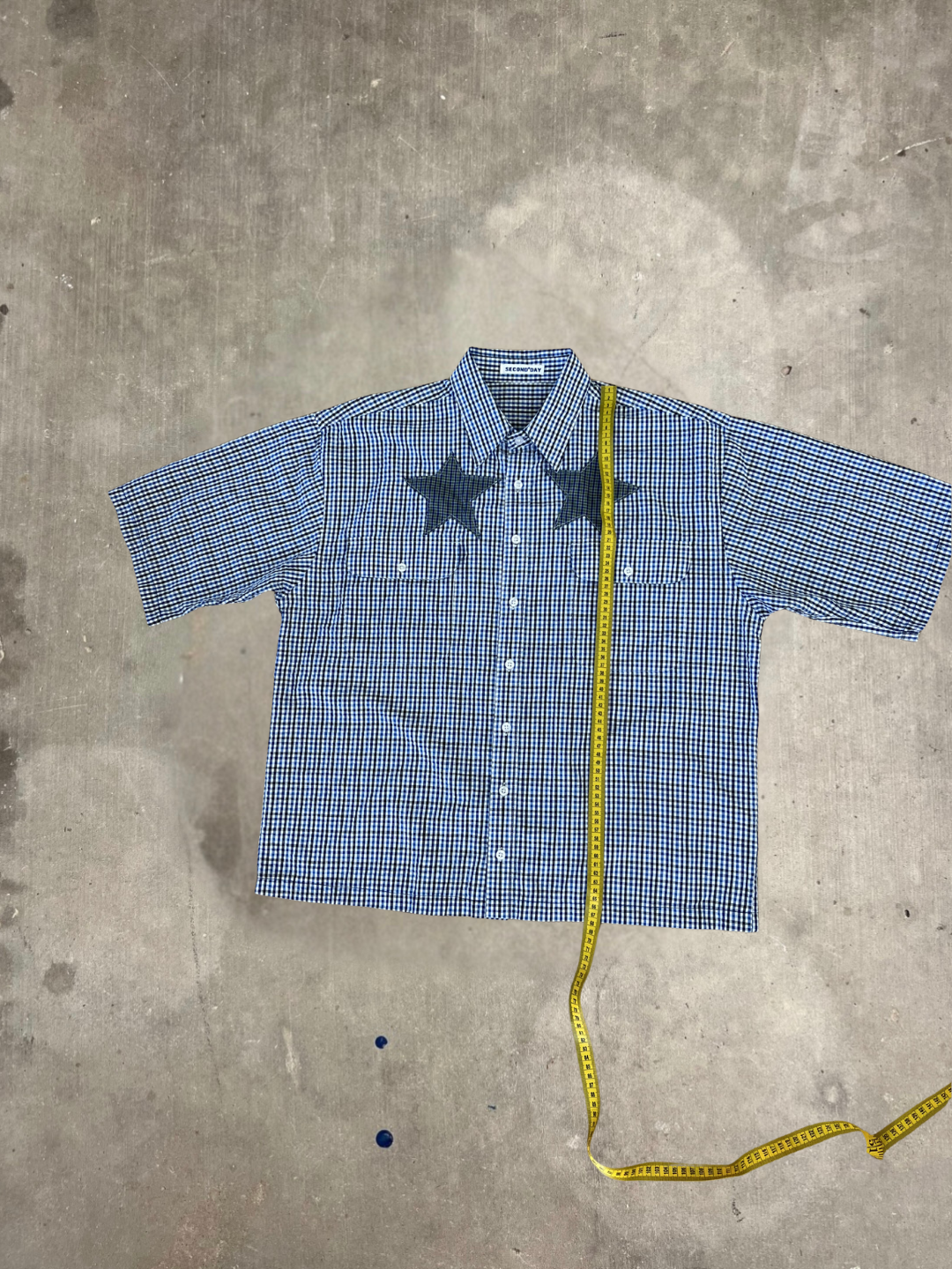 Blue checkered short sleeve button up shirt. Cropped to be a boxy fit and silhouette with short sleeves and patch stars on the front. This shirt has been reworked from a thrifted mens button up shirt